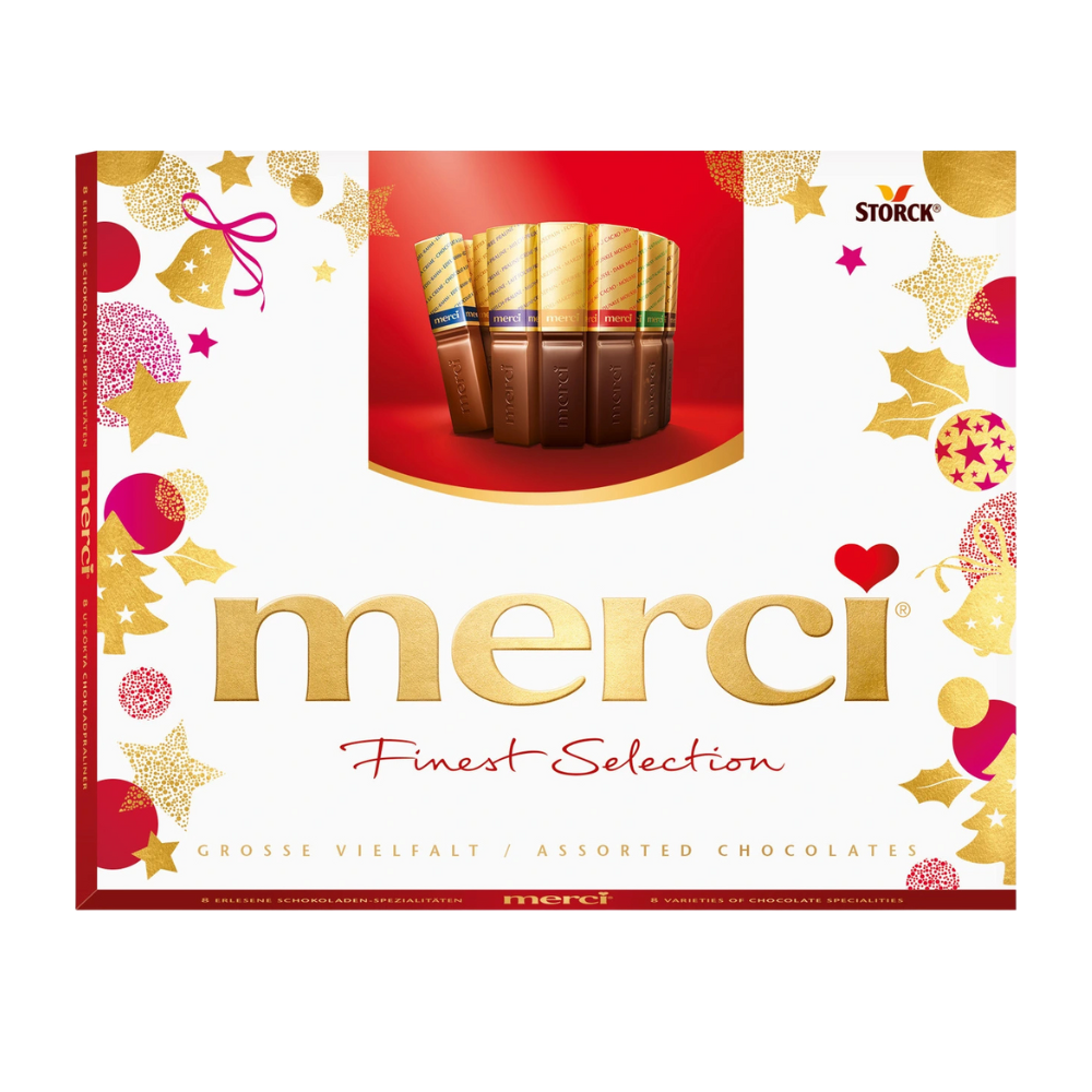 Merci Finest Selection steht für erlesene Schokoladenvielfalt und höchste Qualität. In der 250 g-Packung sind verschiedene Sorten feinster Schokolade enthalten – von zartbitter bis nussig-cremig. Ideal als Geschenk, zum Teilen oder um sich selbst eine besondere Freude zu machen. Hergestellt von Storck in der EU. Kühl und trocken lagern.